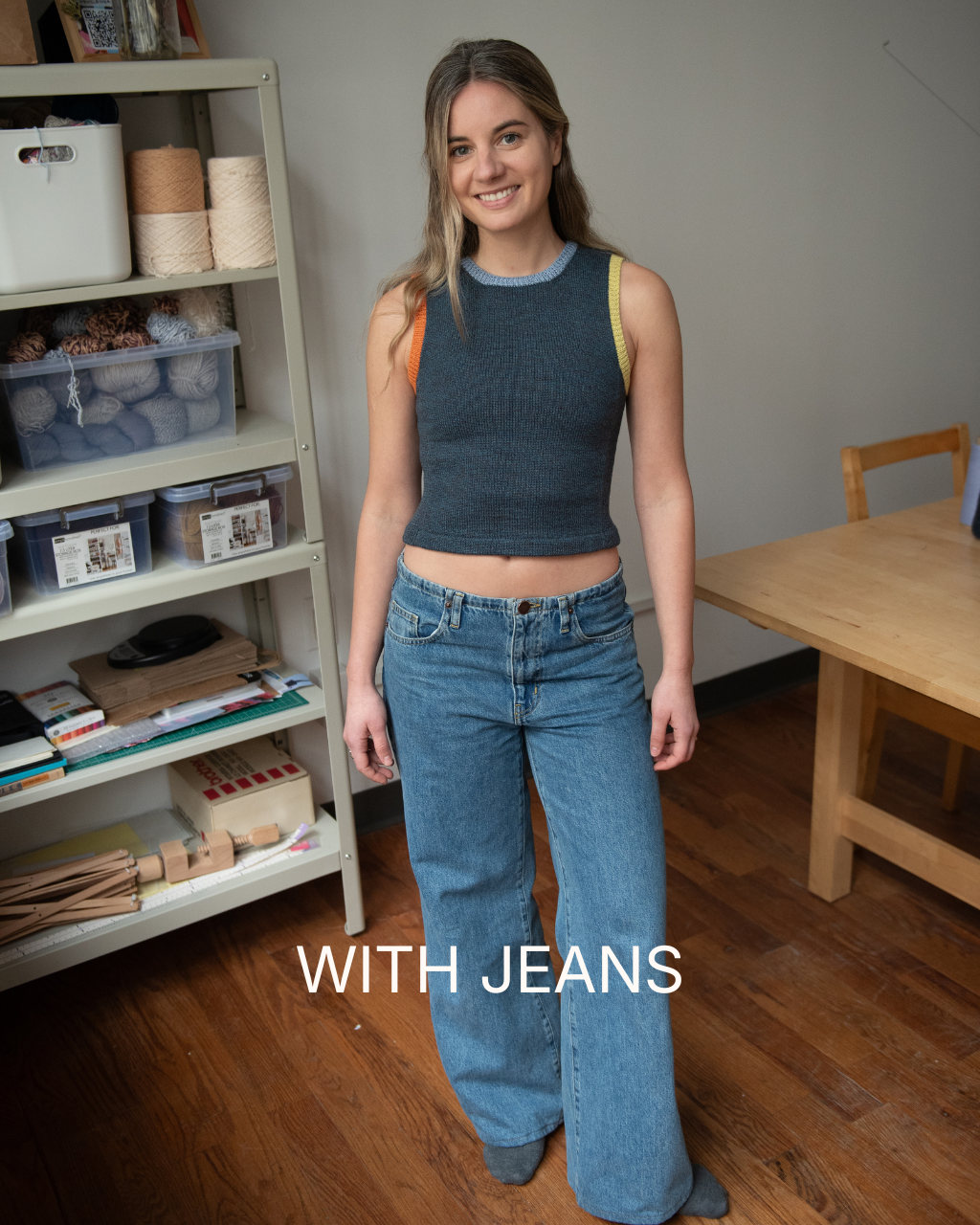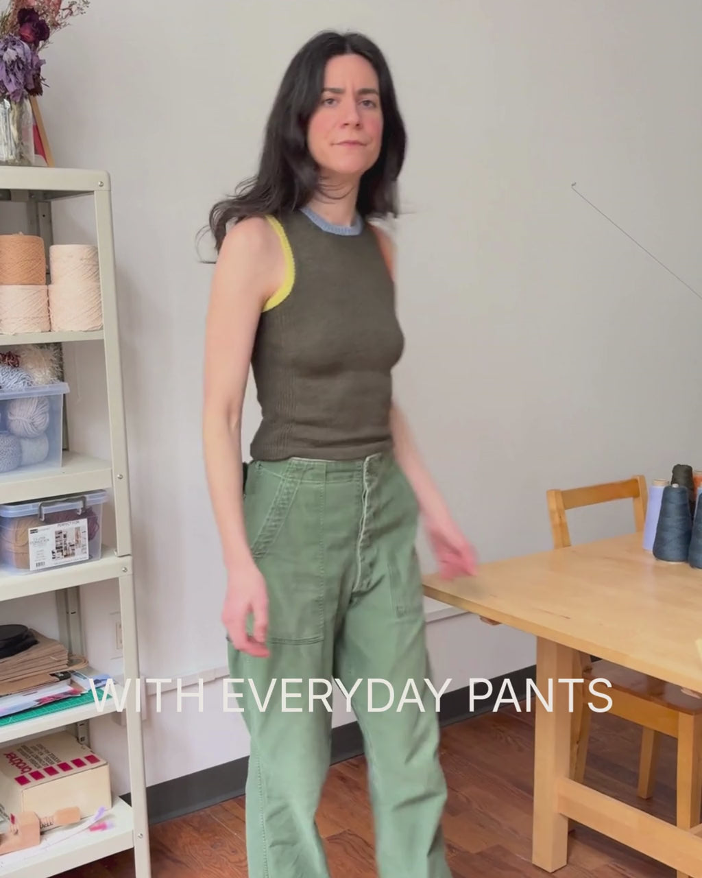 - Claire is wearing a size S (cropped length)